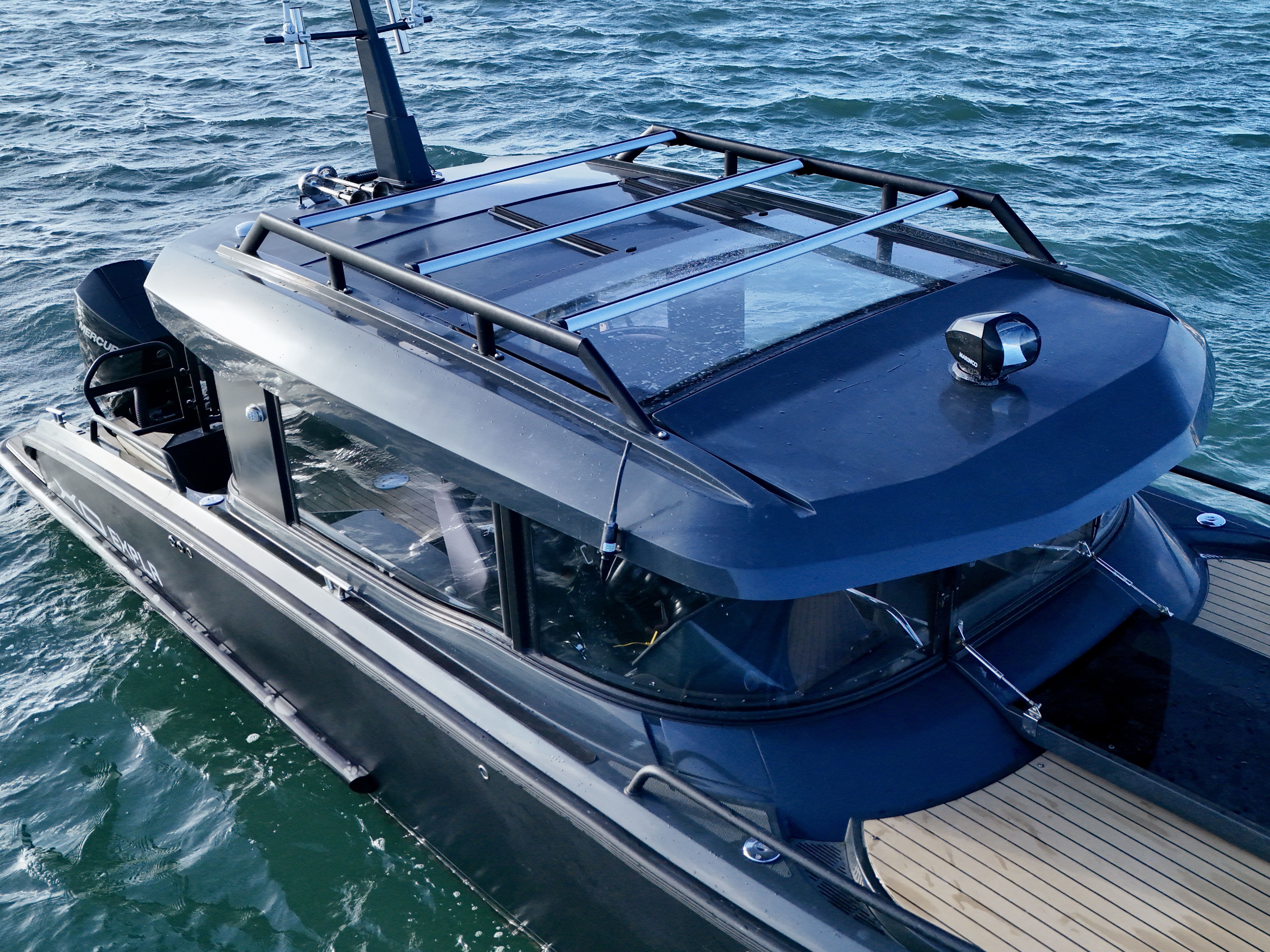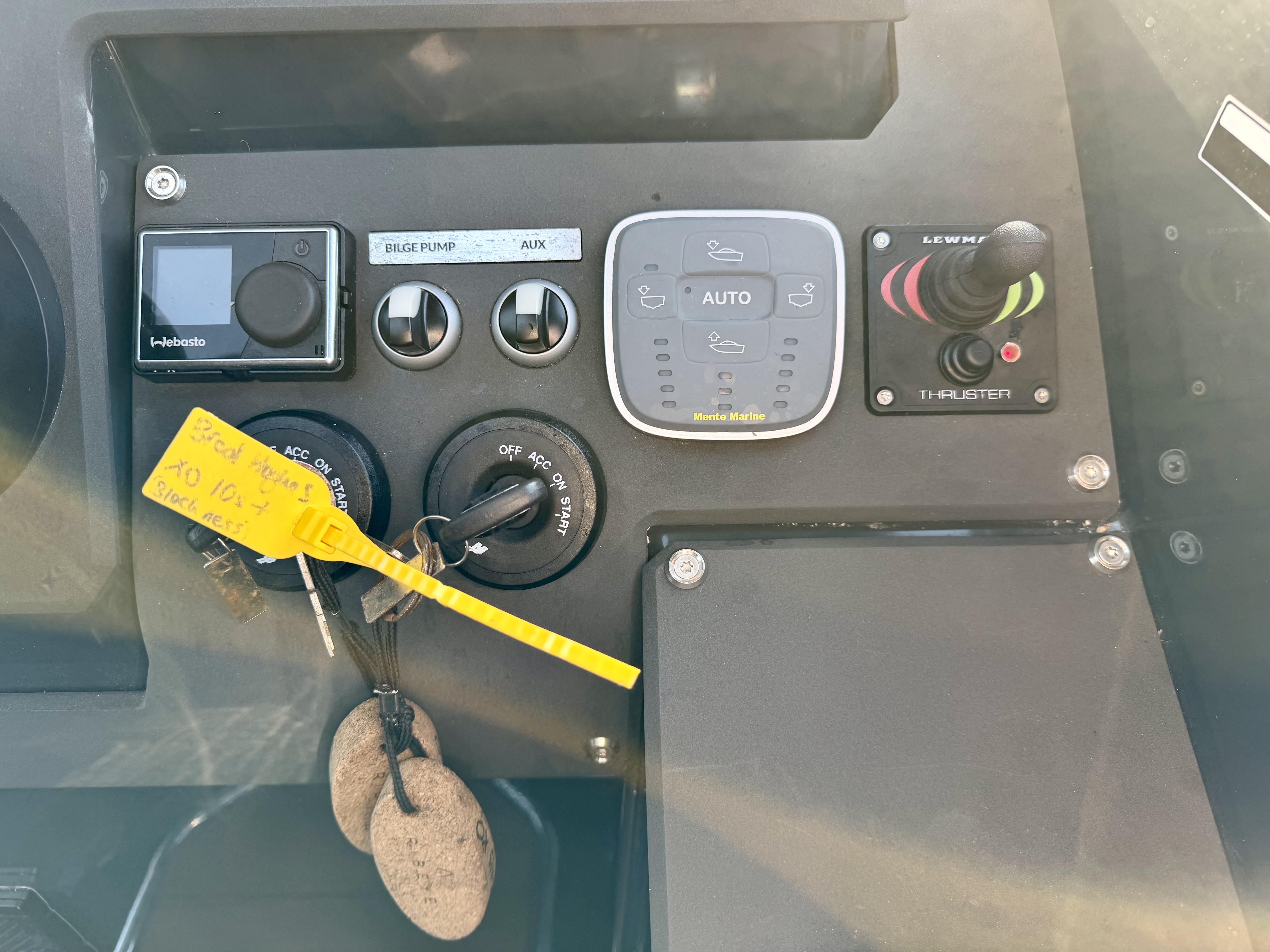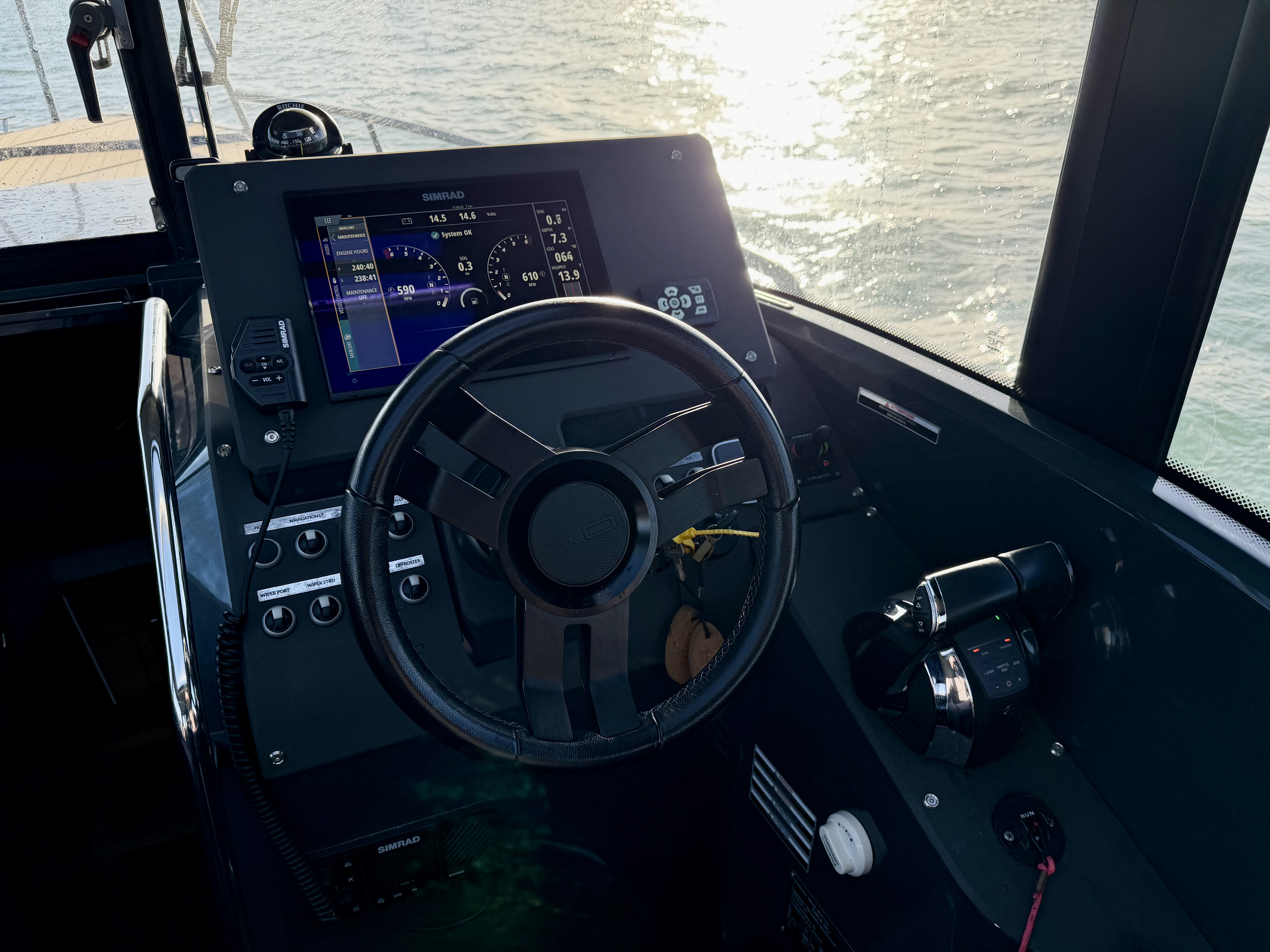 For navigation and safety, the boat is fitted with a Simrad chartplotter, VHF, compass, navigation lights, searchlight, horn, and both automatic and manual bilge pumps, along with fire extinguishers. Performance and handling are enhanced with the Mente Marina Auto Trim System and trim tabs. Additional features include roof racks and fenders with ropes!